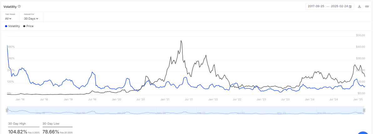 Analysis of the volatility index, measured over 30 days, indicated fluctuating market conditions. Volatility peaked at 104.82% on the 5th of February before dipping to 78.66% on the 20th of February.
