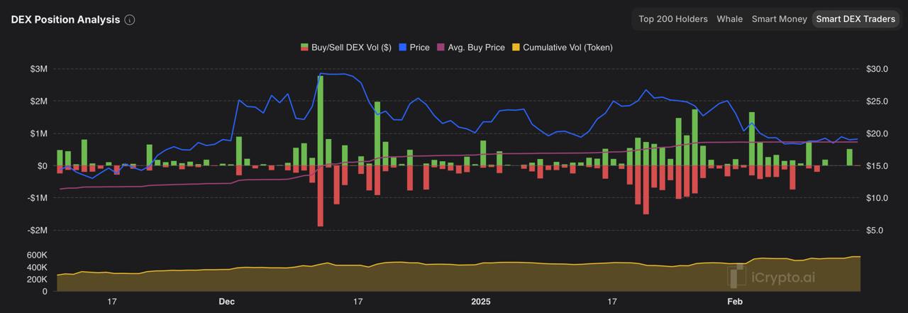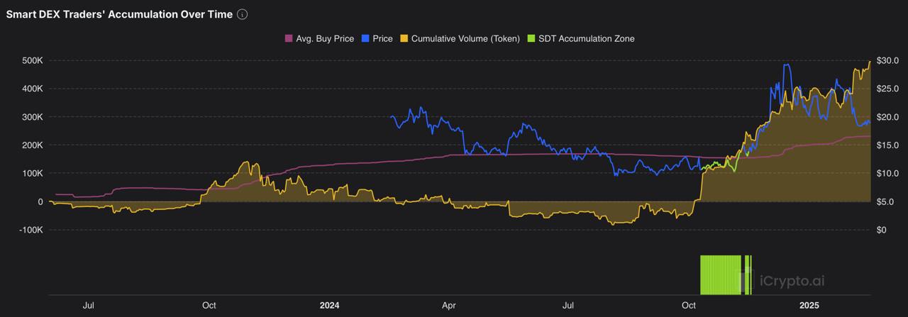 AMBCrypto’s analysis of Smart DEX Traders’ accumulation over time showed a clear upward trend in buying activity, particularly highlighted by a recent sharp increase in accumulation.