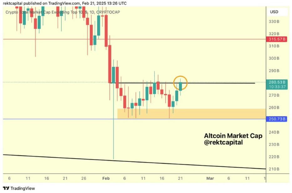 Presently, the altcoin market cap, standing at $280.5 billion, has completed the second part of its previously formed Double Bottom pattern. This unique technical pattern is often seen as a bullish indicator, signaling a potential reversal from a downtrend to an uptrend. According to Rekt Capital on X, the altcoin market cap is attempting to break out of this pattern and initiate a bullish move towards a $300 billion valuation.