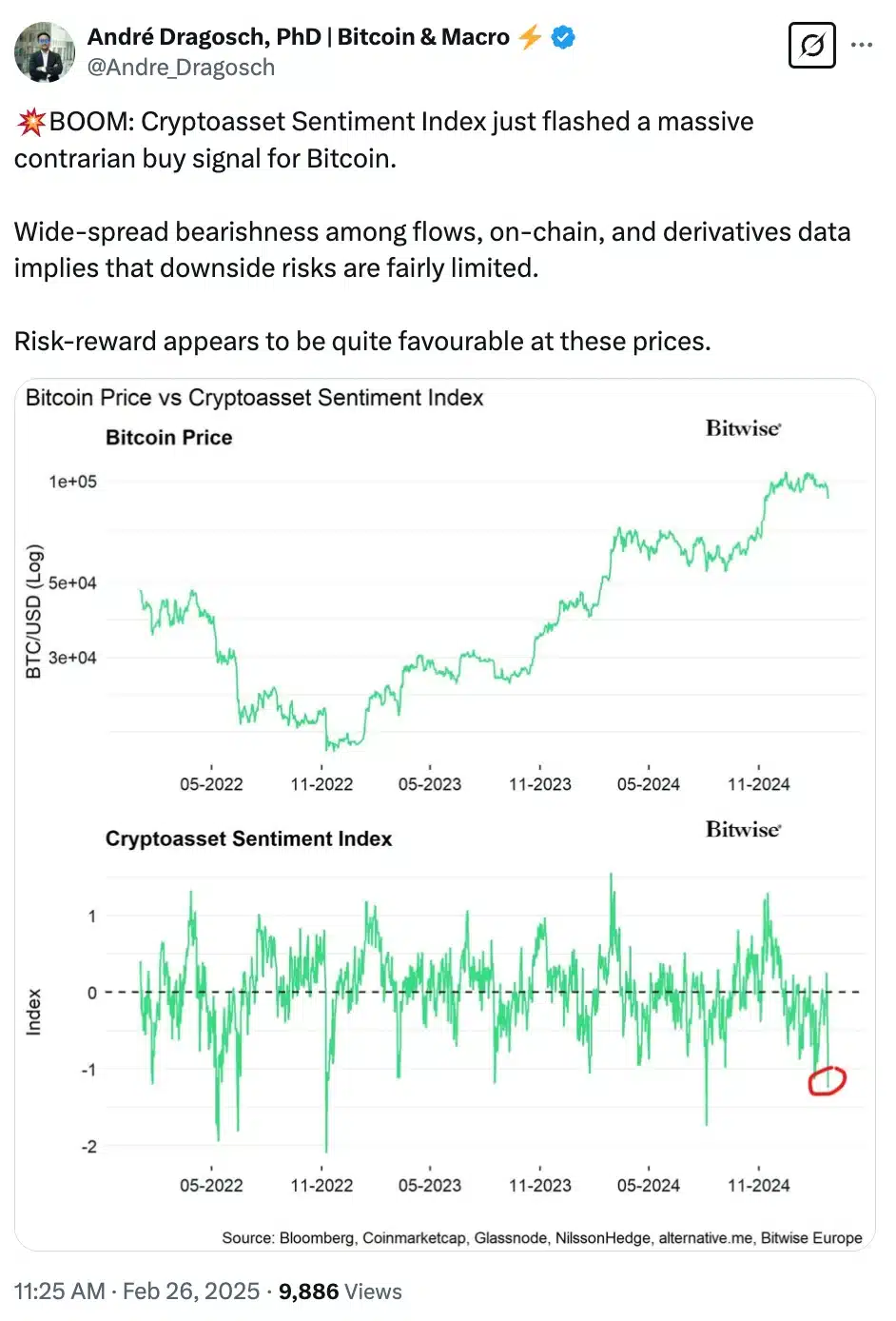 Andre Dragosch, European Head of Research at Bitwise, pointed to the Cryptoasset Sentiment Index, which signals a strong contrarian buy opportunity for Bitcoin.