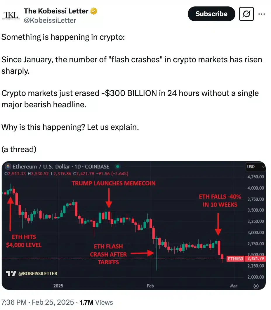 According to the Kobelsi Letter’s recent post, the rise in flash crashes highlights the growing unpredictability of the crypto sector.