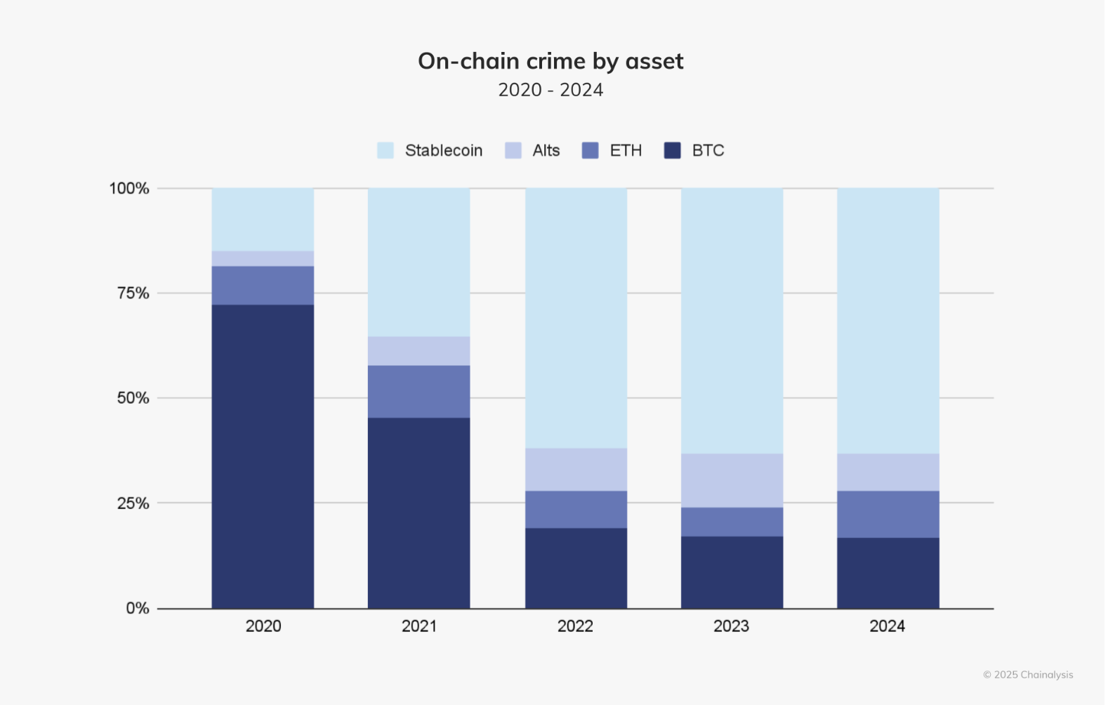 Bitcoin was the currency of choice for cybercriminals for years, but this changed in 2022. The 2025 Chainalysis report shows a seismic shift to stablecoins that now account for 63% of all illicit crypto transactions.