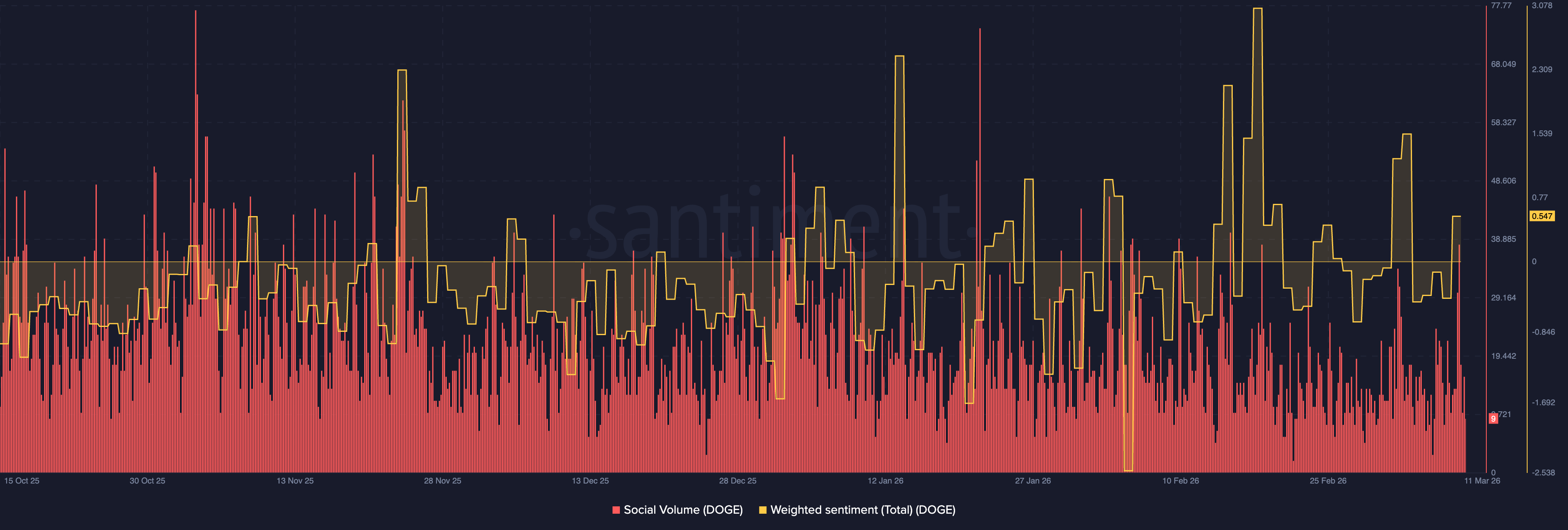 Spikes in Social Volume often align with sharp changes in sentiment. As of early March, sentiment turned positive while social activity remained high, signaling renewed speculative interest.