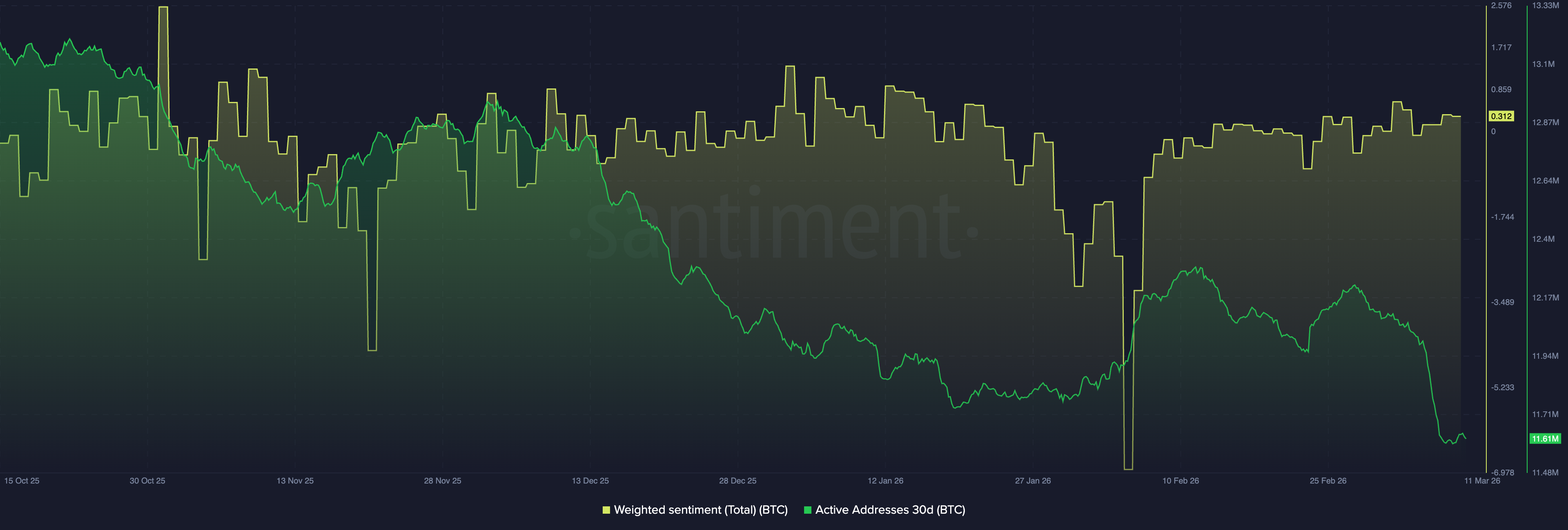 However, on-chain data reveals a divergence. While Weighted Sentiment around Bitcoin has remained slightly positive and stable, 30-day Active Addresses have fallen to around 11.6 million at press time, one of the lowest levels recently.