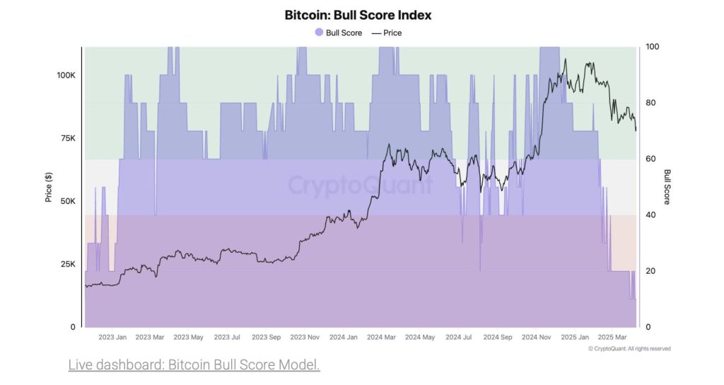 According to CryptoQuant’s Bull Score Index, Bitcoin currently registers a reading of 10, its lowest since November 2022.