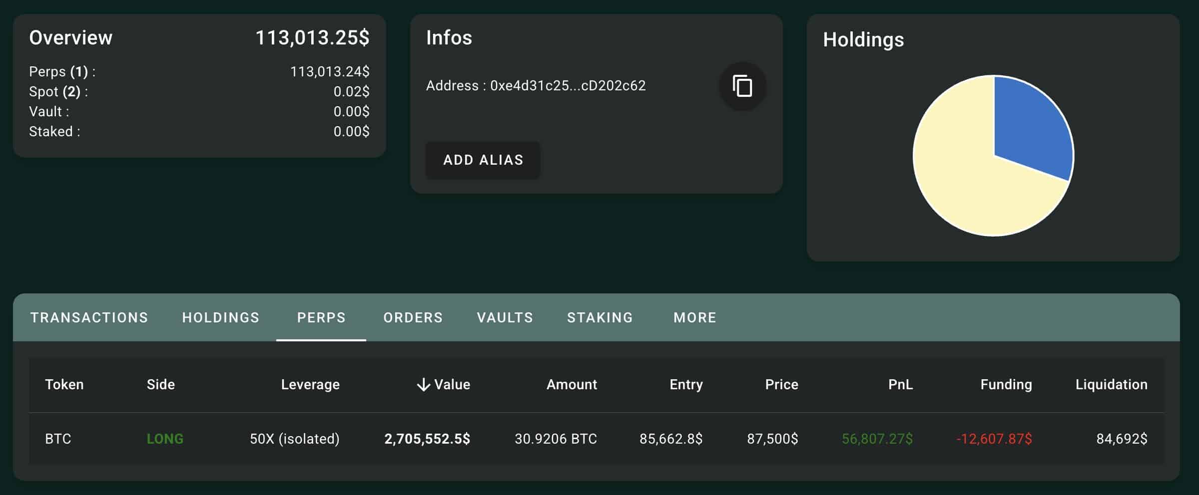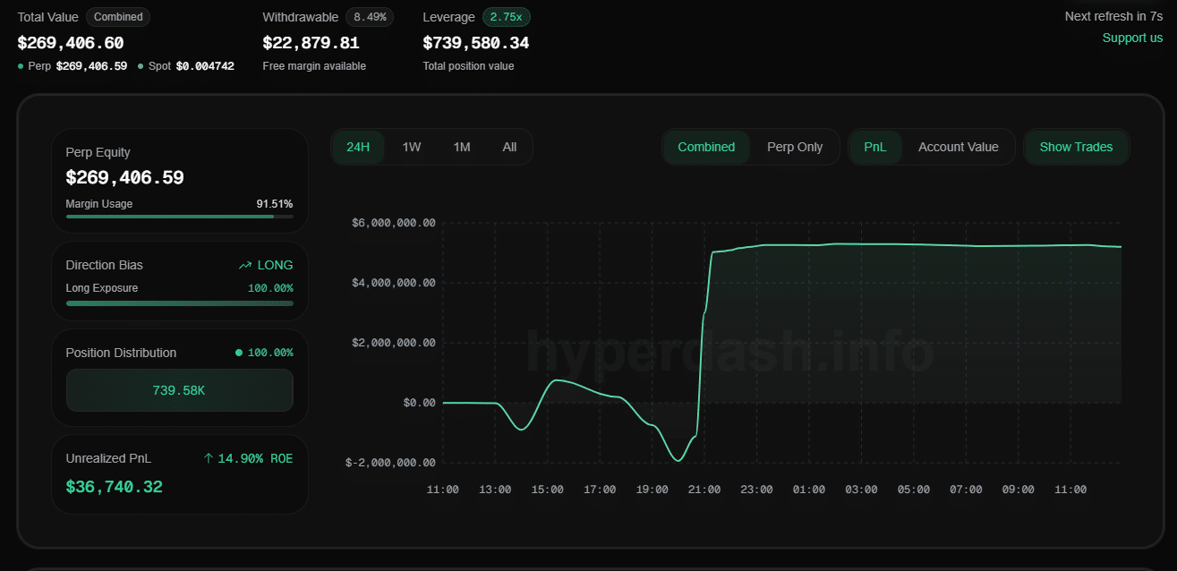 Afterward, unrealized PnL stabilized between $36K and $44K as positions were closed. The account’s total position value remained steady around $740K throughout this period.