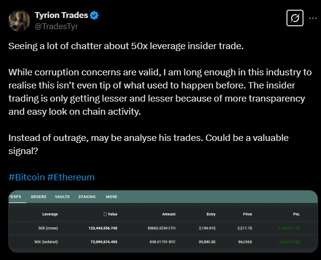 Veteran trader Tyrion Trades acknowledged the concerns but suggested blockchain transparency is making insider trading harder to conceal,