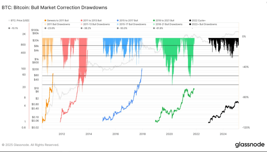 The fact that the current Bitcoin market cycle is less volatile than previous bull runs is among its most noteworthy features. The following patterns of drawdown are seen in historical data from prior cycles: