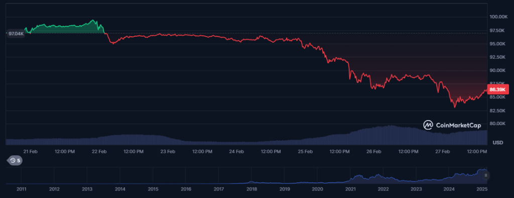 On February 27, 2025, Bitcoin was trading at $85,800, representing a 4% decrease from the previous day’s close. The intraday high was $89,230 and the intraday low was $82,460. The most recent 15% decline in the weekly frame surpasses the cycle’s average drawdown of 8.50% but is significantly less than the 26% decline in previous cycles.