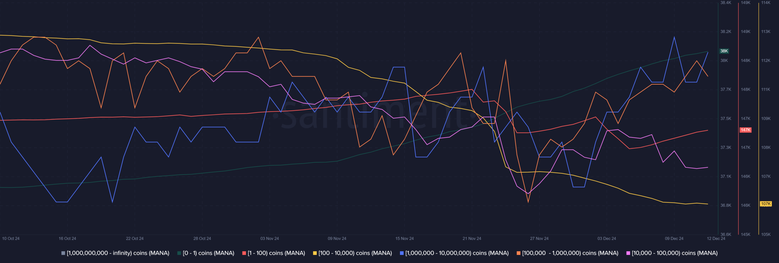 The supply distribution for MANA revealed that some of the larger cohorts of holders have been accumulating the token since late November. The 100k-10 million group in particular was an encouraging sight. The increased number of wallets holding these amounts of MANA indicated accumulation, while the shrimp wallets with 100 or fewer MANA have been falling in number.