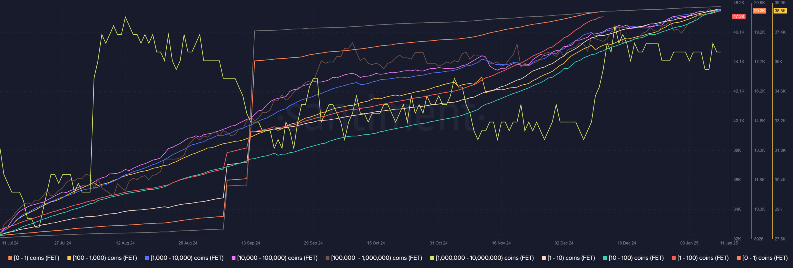 FET also had a similar accumulation trend among larger holders. Wallets with 100-10 million FET have risen in number since the start of December. With planned token burns and deflationary pressure on the Artificial Superintelligence Alliance ecosystem, sustained accumulation indicated steady demand.