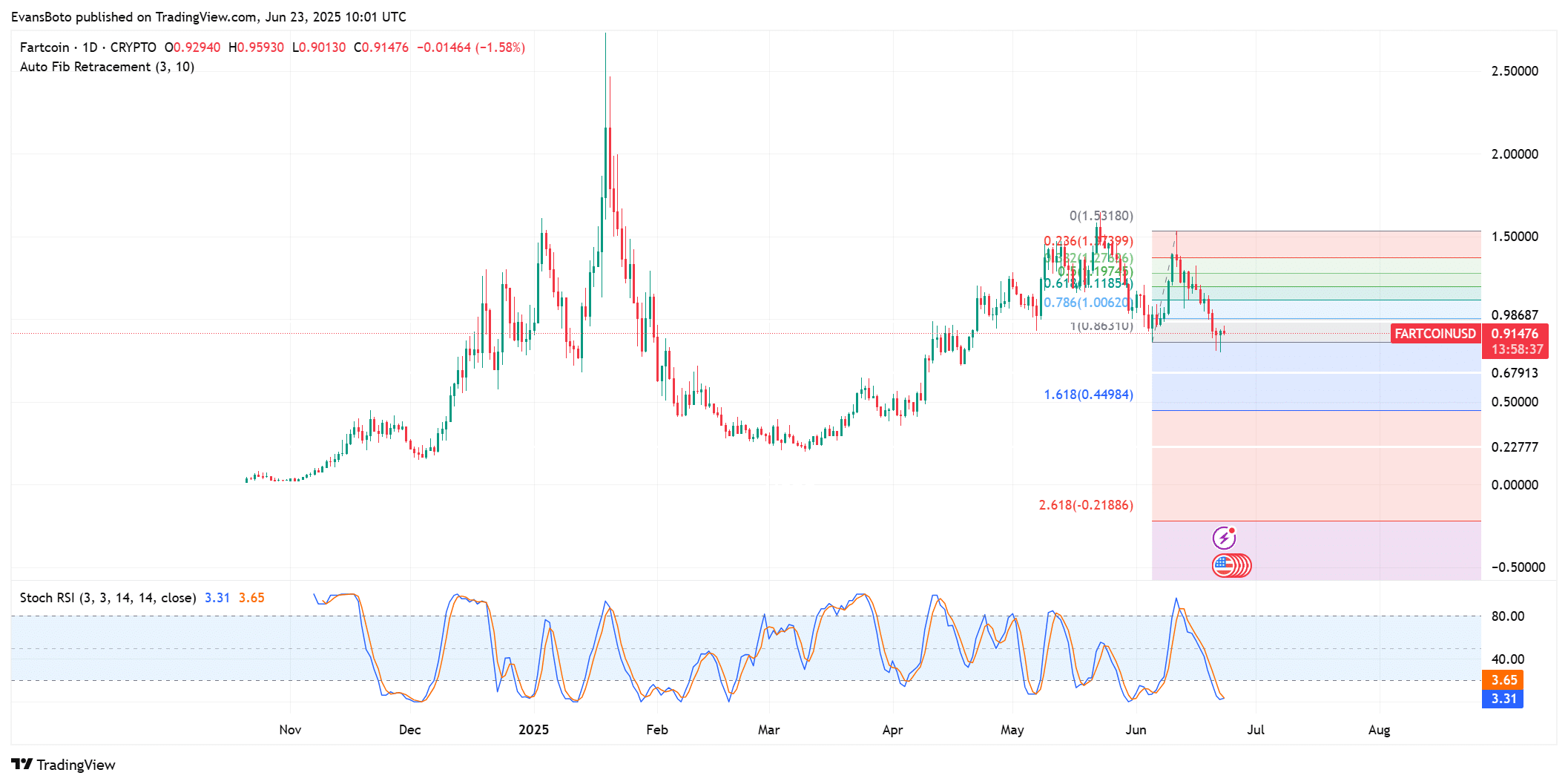 At the time of writing, FARTCOIN was holding above the 0.786 Fibonacci retracement zone, hovering around the $0.91–$0.93 region.