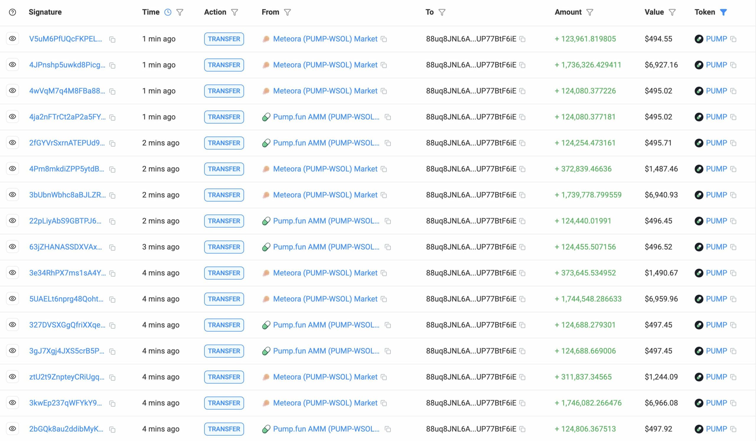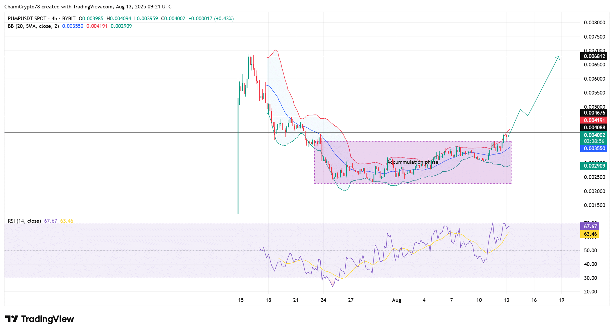 PUMP broke out from a multi-week accumulation phase between $0.00290 and $0.00355, riding higher volume.