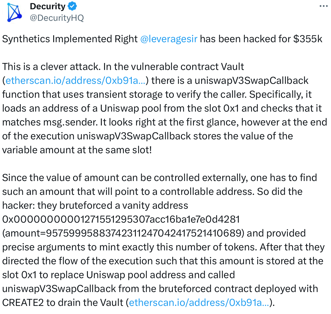 Decurity described the hack as a “clever attack” that targeted a callback function used in the protocol’s “vulnerable contract Vault” which leverages Ethereum’s transient storage feature.