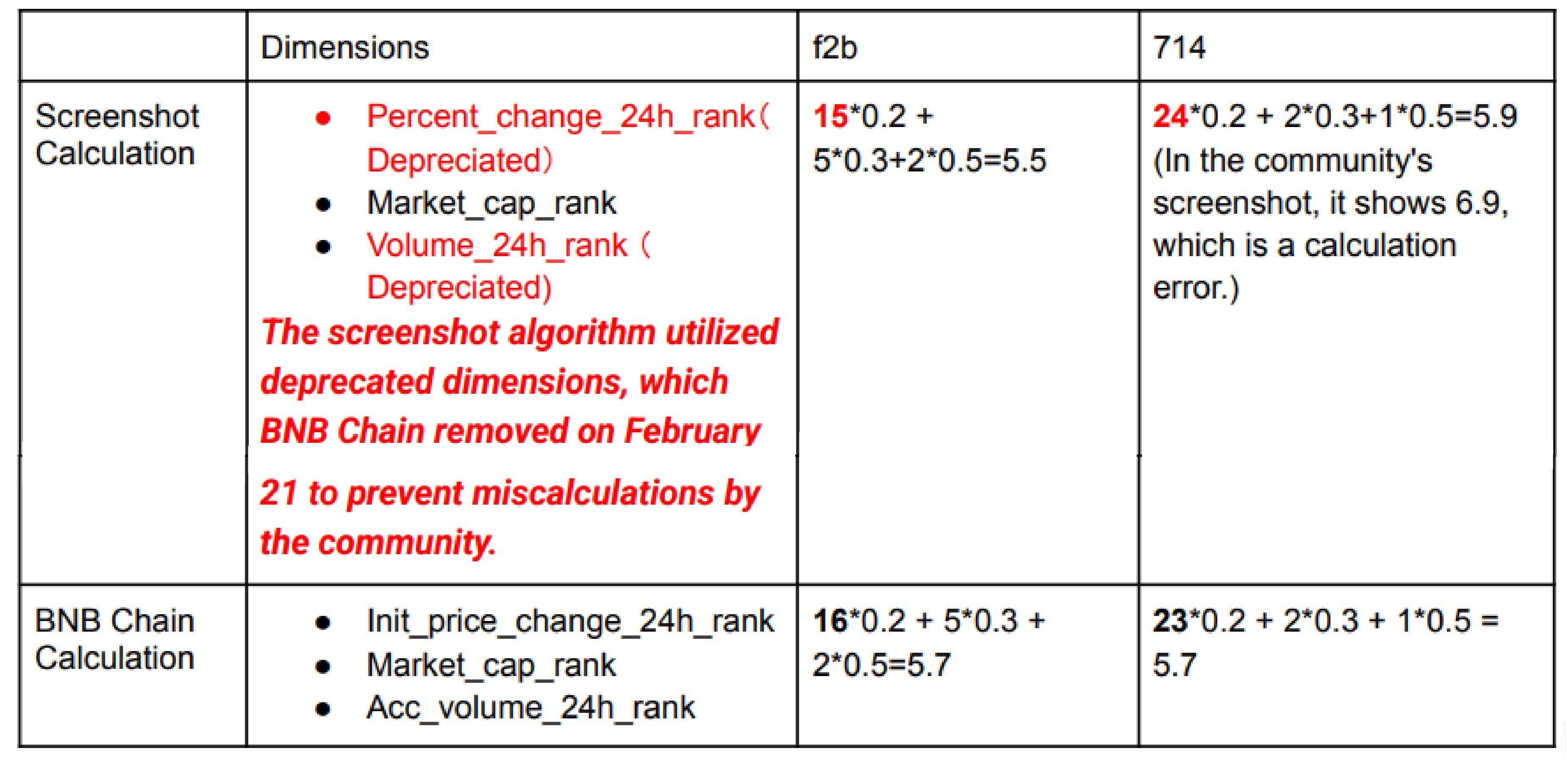 The F2B community also attempted to calculate the scores themselves based on the formula cited by BNB Chain in a Feb. 14 blog post, and again in a Feb. 18 X post: