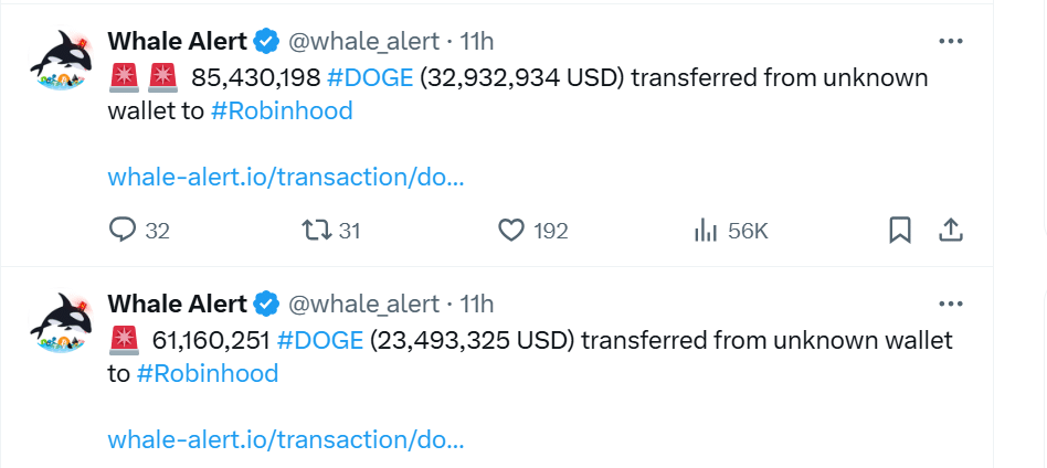 - Whales could also profit after two large addresses moved $56M worth of DOGE to Robinhood.