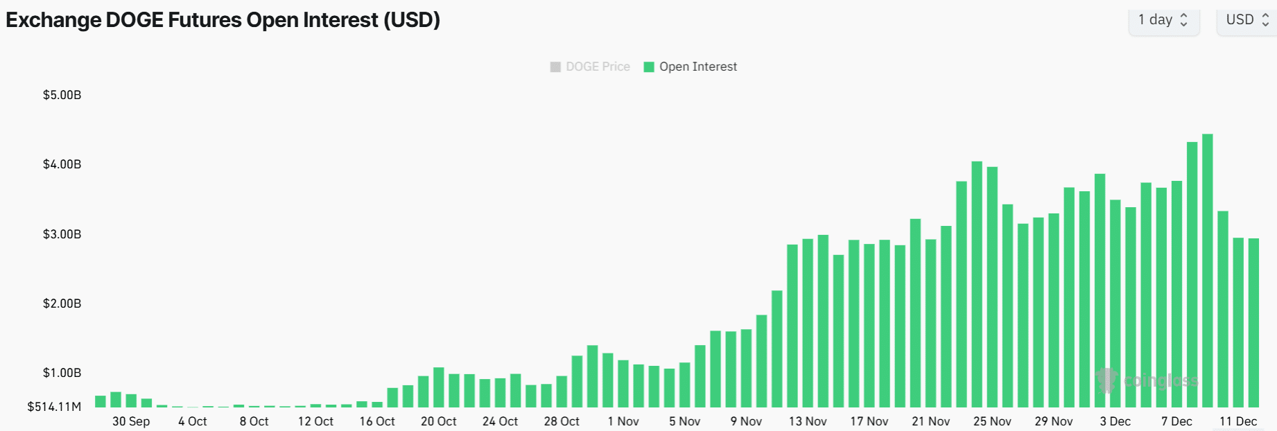 Dogecoin’s Open Interest(OI) reached an all-time high of $4.45 billion on the 9th of December after tripling in less than one month as speculative interest in the memecoin increased.