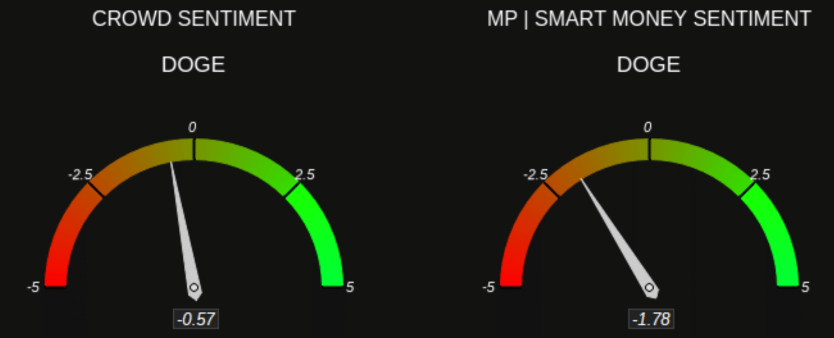 These bearish signs have dampened the market sentiment around Dogecoin, as depicted by Market Prophit. Both the crowd and smart money sentiment on DOGE are bearish, indicating that traders anticipate further dips.