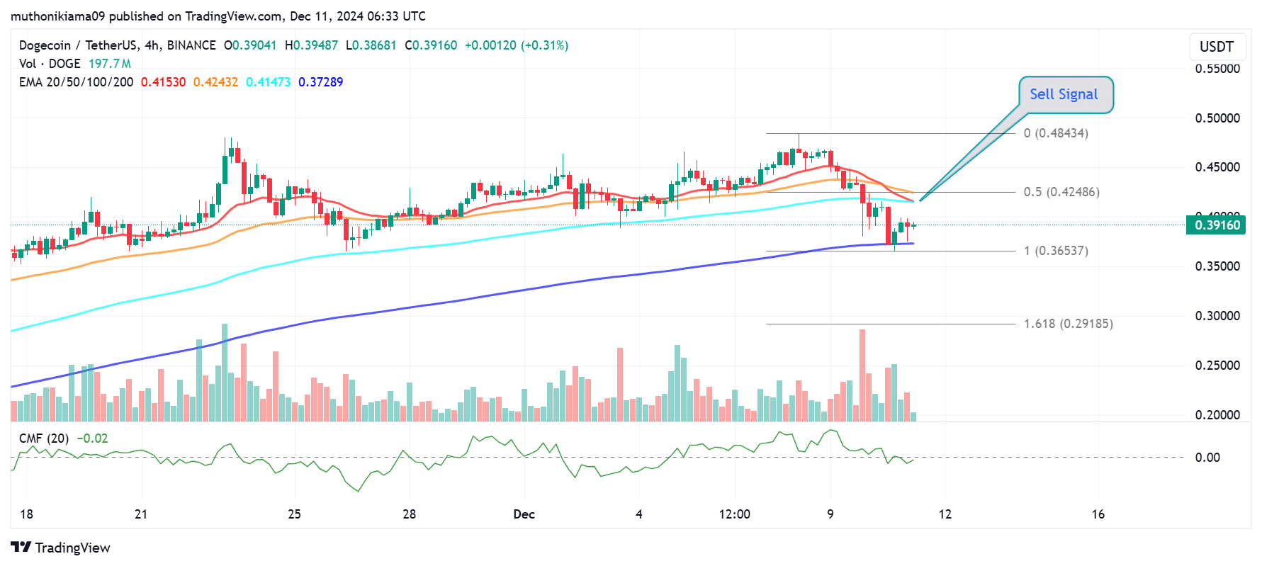 A crucial support level lies at the 200-day EMA ($0.34). If Dogecoin falls below this price, the long-term trend could also flip negative.