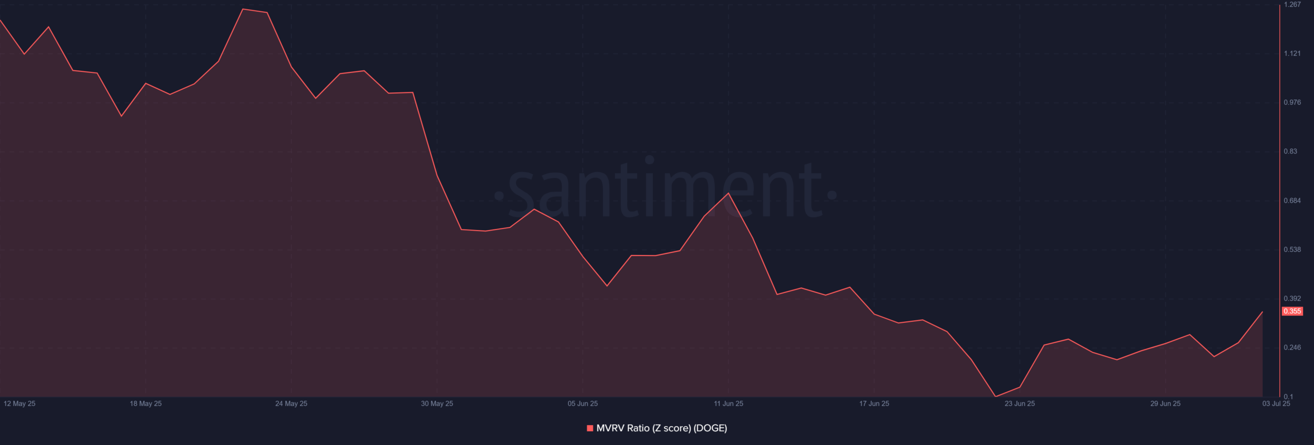 Dogecoin’s MVRV Z-score has rebounded to 0.355 after dipping to near-historic lows in late June.