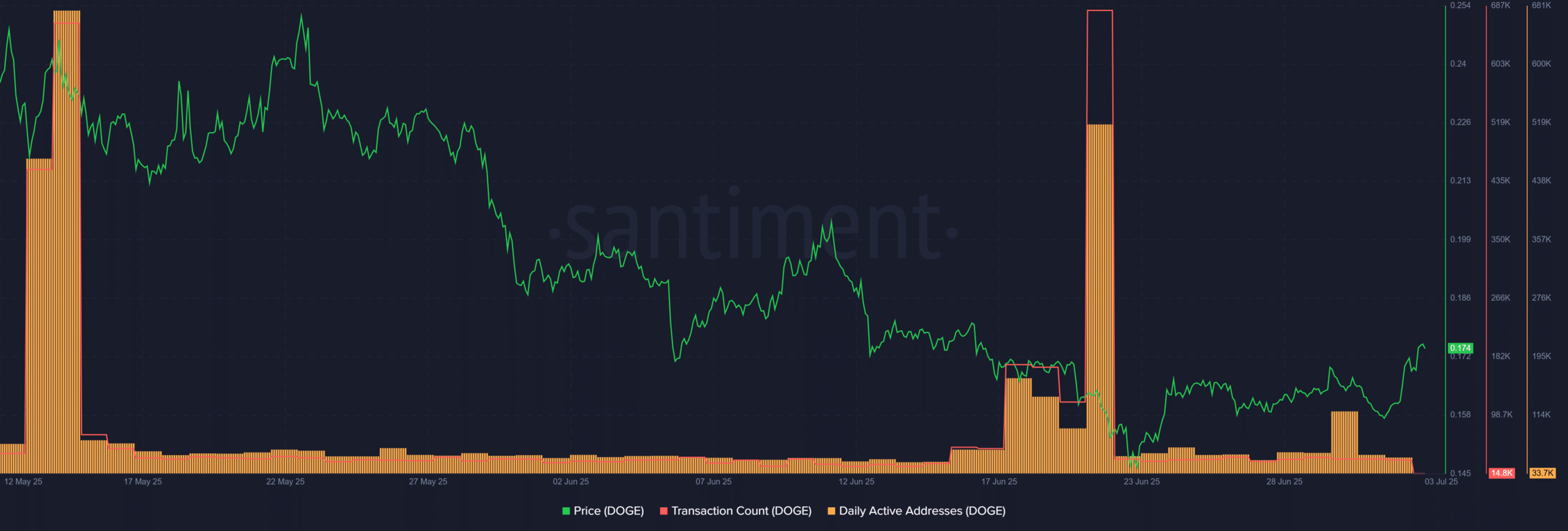 Despite the recent price rebound, Dogecoin’s on-chain activity has slowed sharply. Daily active addresses fell to 33.7K, while transaction count dropped to 14.8K as of the 3rd of July.
