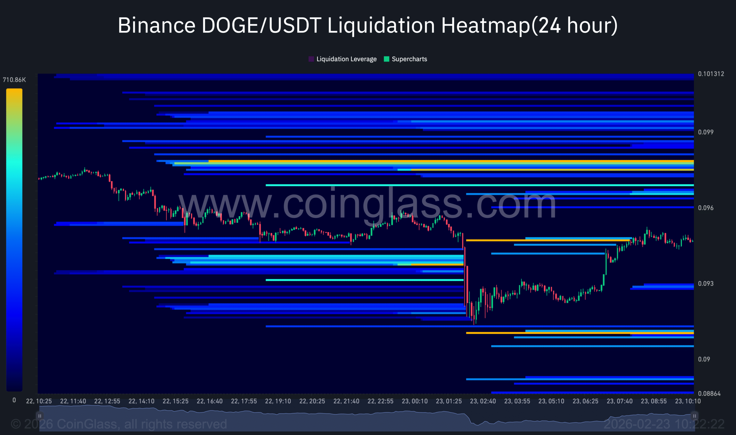 At present, significant liquidity sits above DOGE’s current price. The Binance liquidation heatmap shows deeper clusters on the upside compared to the immediate downside.