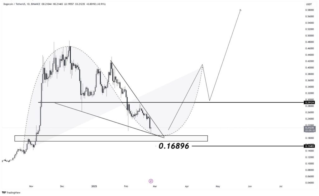 “DOGE is showing strong bullish potential as it approaches a key reversal zone. Price has reached the $0.16896 support, aligning with a potential Cup & Handle formation. A breakout above $0.29124 could confirm a rally toward new highs,” Rose Premium Signals writes via X.
