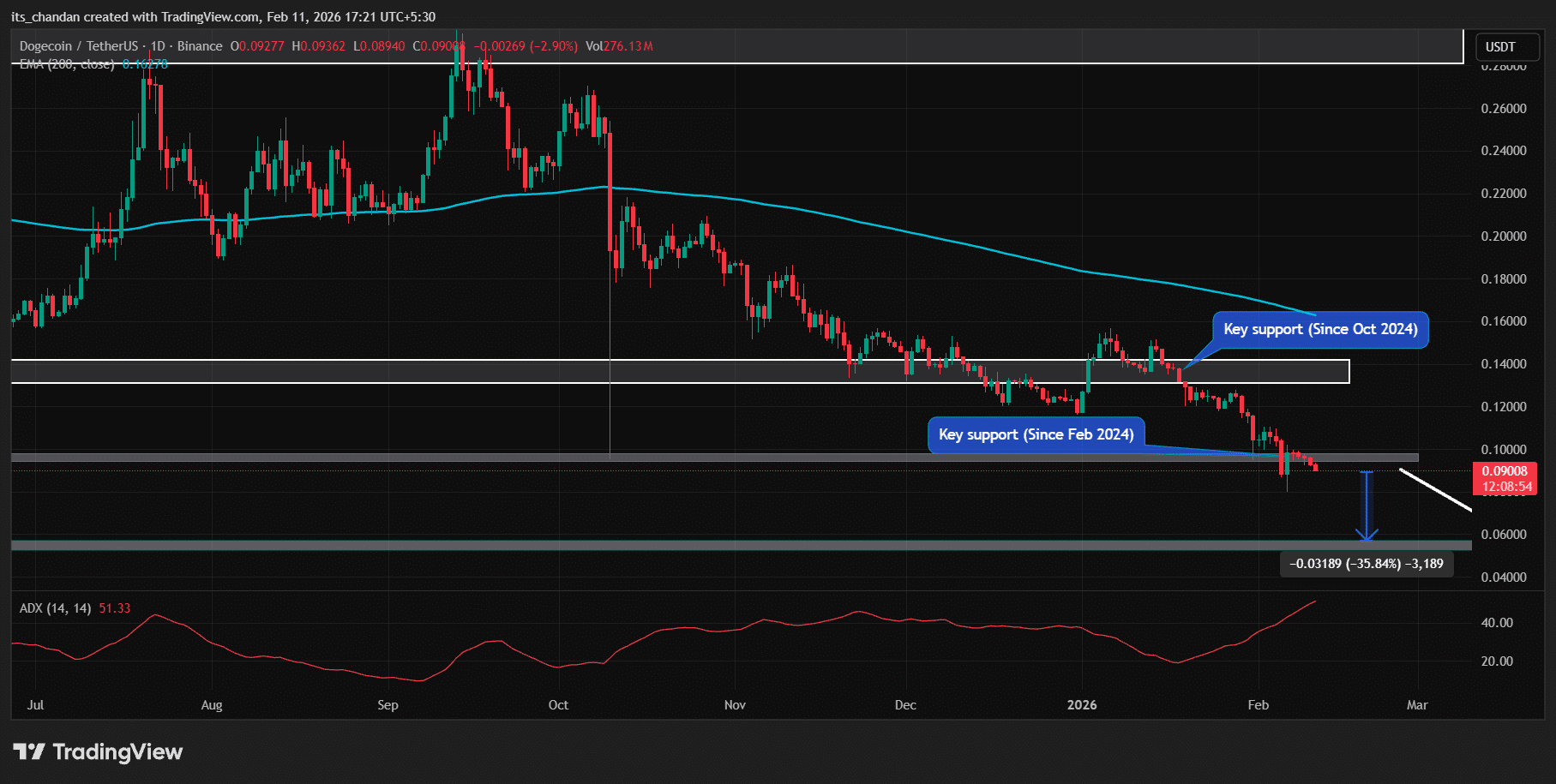 - DOGE has lost its key support at $0.095, a level it had been holding since February 2024, and current price action now hints at another potential 35% decline ahead.