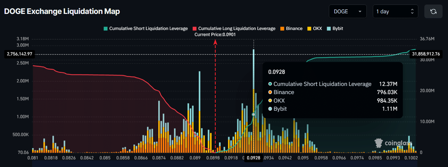 Currently, $0.0892 on the downside and $0.0928 on the upside are the two major levels where traders are overleveraged, with $4.13 million worth of long positions and $12.37 million worth of short positions built up.
