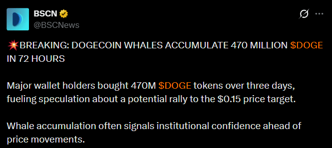 - Whales added 470 million DOGE as the price hovered near a historic reversal area amid the ongoing market dip.