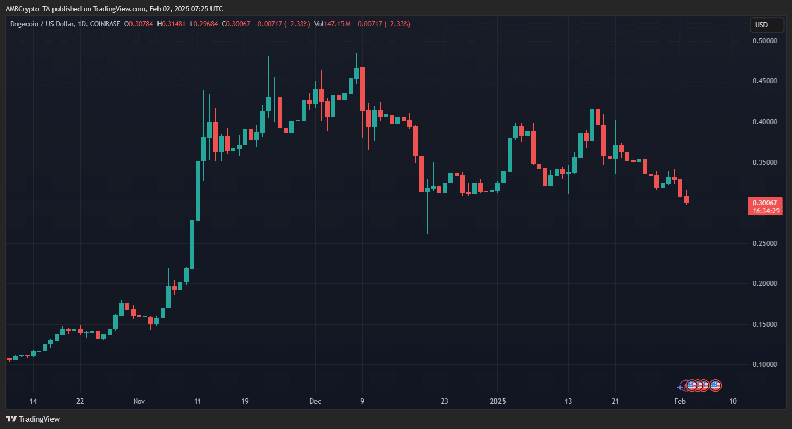 As Dogecoin hovers around the $0.30 mark, traders are debating whether the price will continue its rally or retest lower support levels before another move upward.