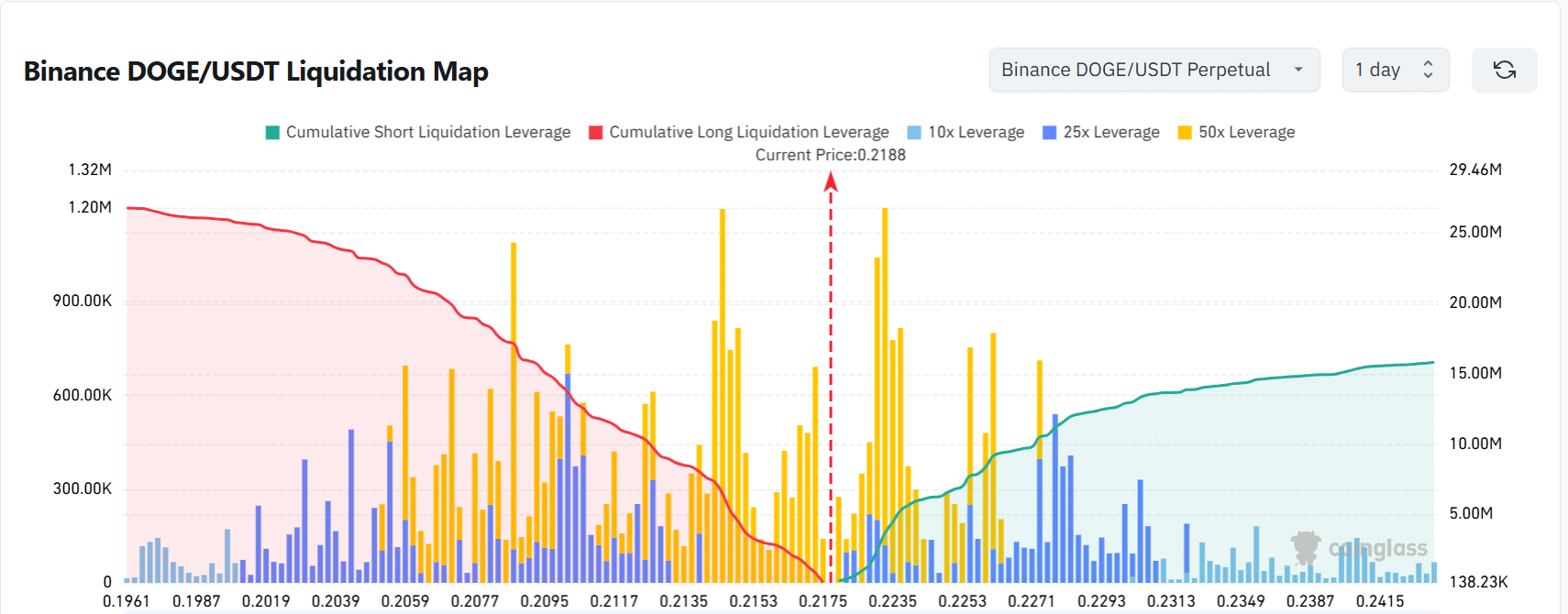 If DOGE dips below $0.215, long liquidations may accelerate selling, while a surge beyond $0.225 could trigger short squeezes.