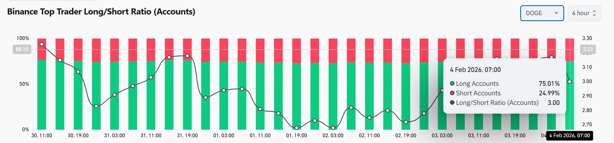 Derivatives positioning revealed aggressive optimism among Binance’s top traders. Long Accounts rose to about 75%, while the Long/Short Ratio climbed near 3.0.