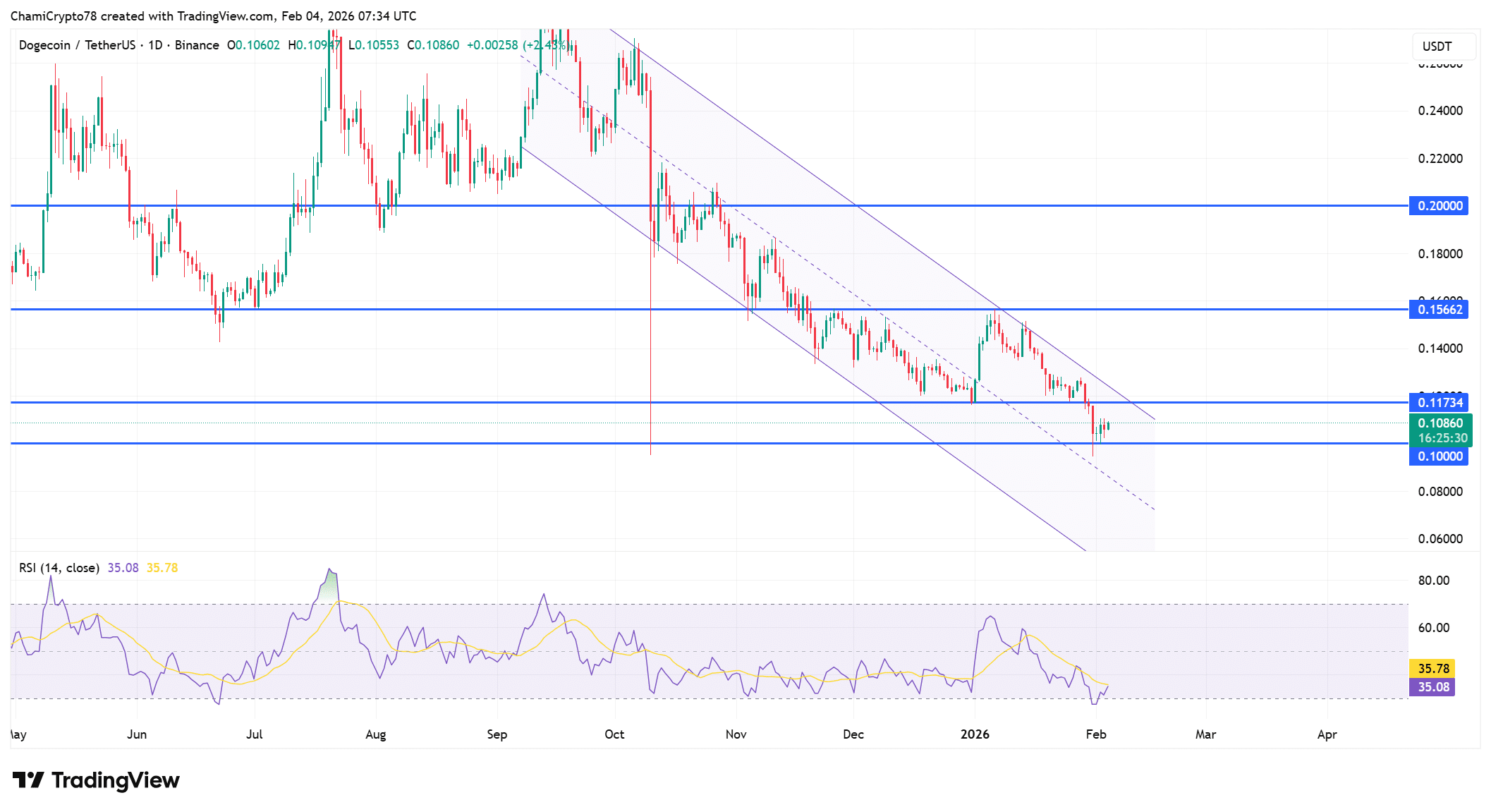 - DOGE remained stuck inside a descending channel, with lower highs controlling the trend since late 2025.