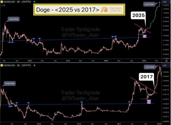 According to prominent crypto analyst Trader Tardigrade, Dogecoin’s trend pattern in 2017 closely mirrors its current movement. The analyst has shared a chart providing a comparative analysis of Dogecoin’s price action in 2017 and its projected movement in 2025.