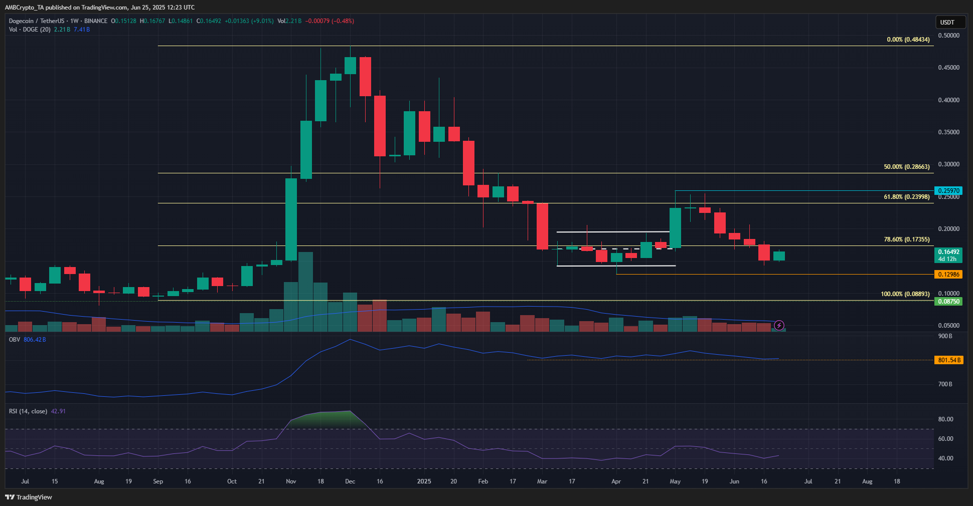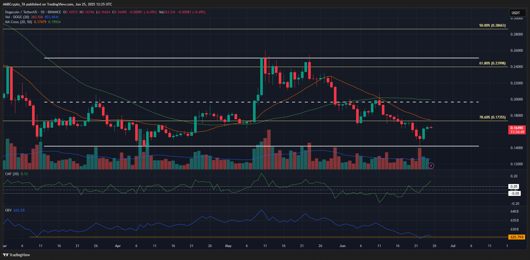 Dogecoin [DOGE] retested the $0.142 support level from April, which had been a range low at the time.