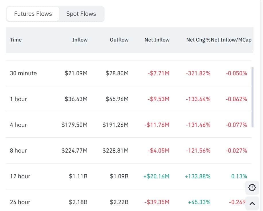 On the futures side, traders aggressively closed their positions as they derisked and deleveraged. CoinGlass data showed that Dogecoin recorded $2.22 billion in Futures outflows compared to $2.18 billion in inflows.