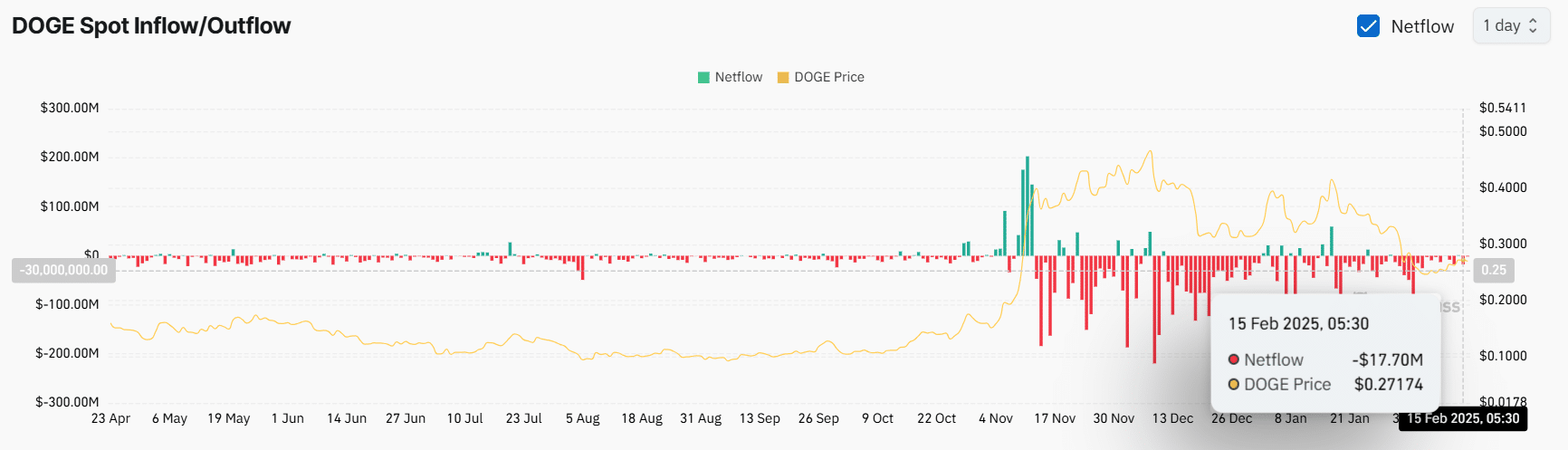 Data from Spot Inflow/Outflow analysis showed that cryptocurrency exchanges have witnessed an outflow of a significant $18 million worth of DOGE. The trend indicates potential accumulation.