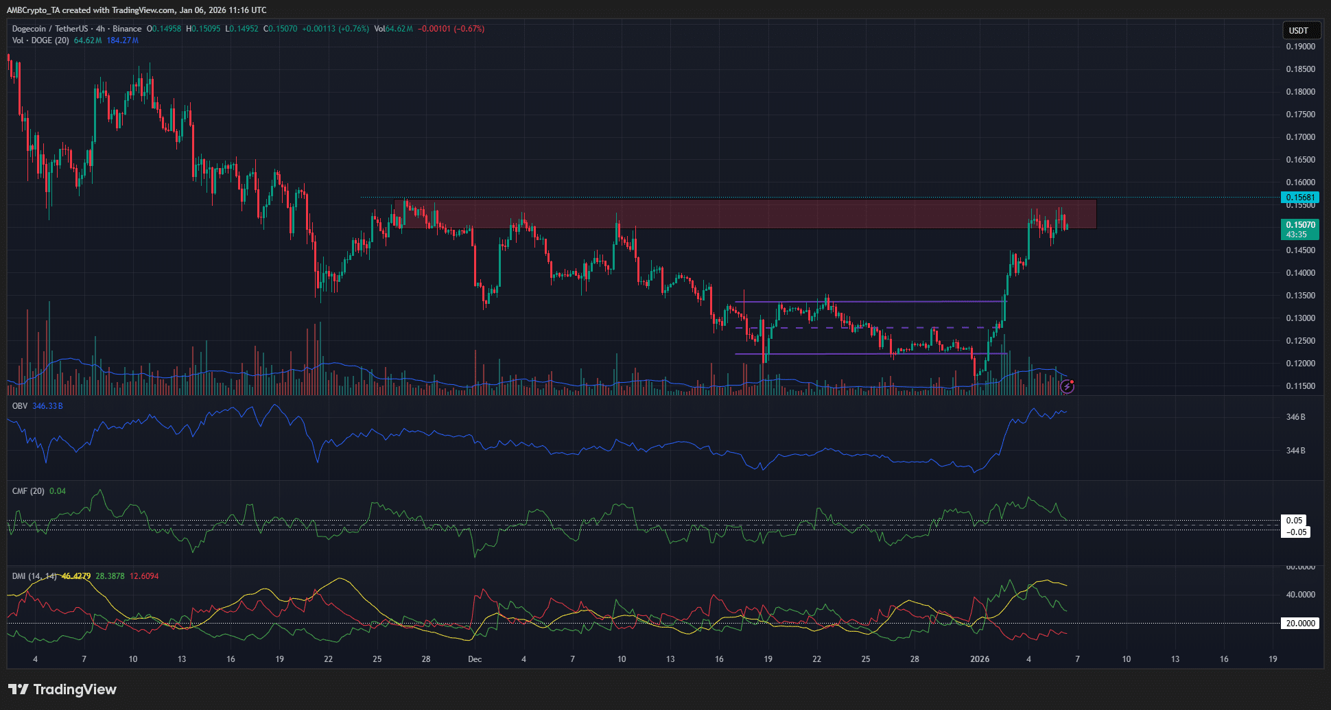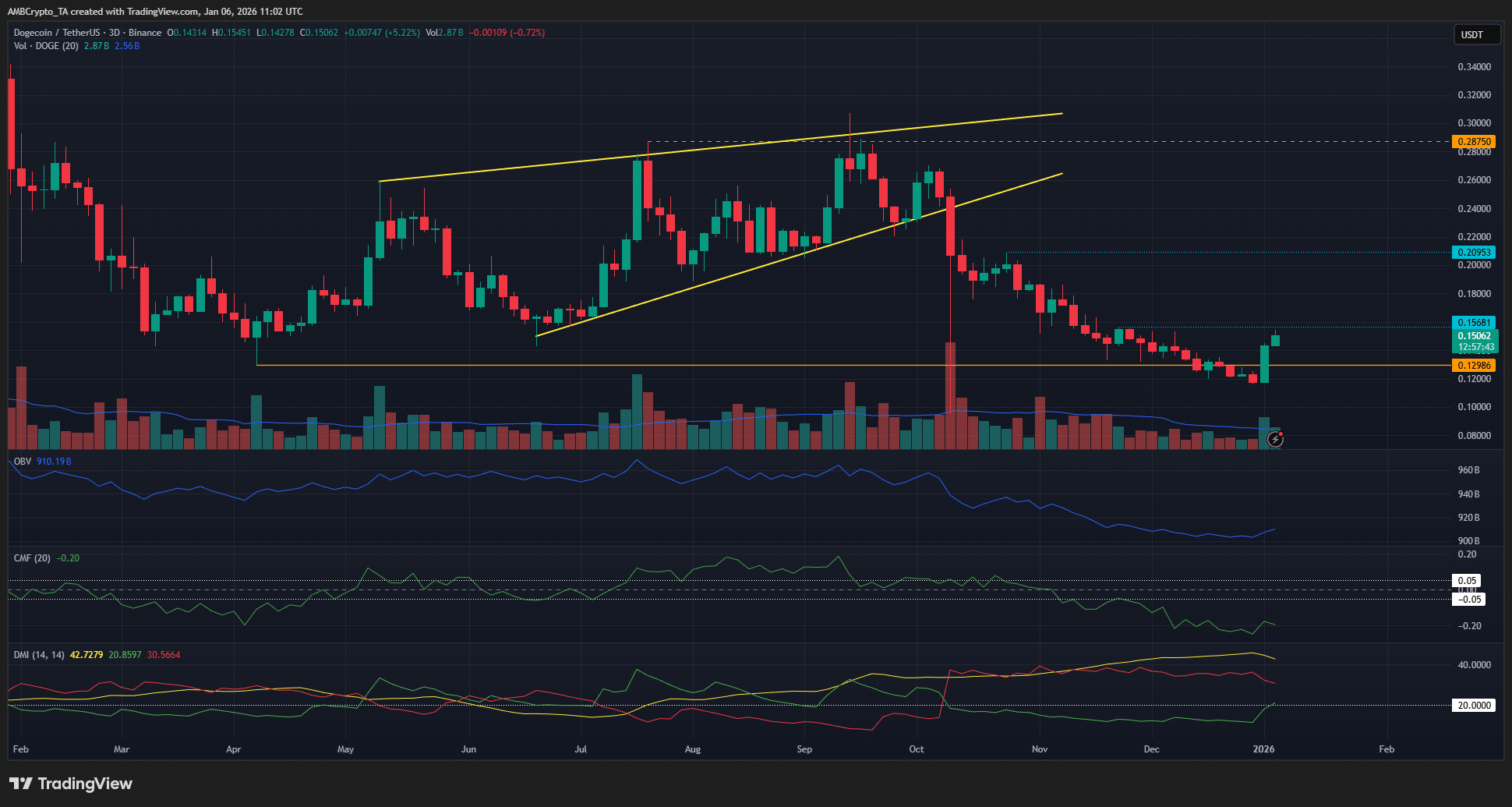 Dogecoin [DOGE] fell below a two-week range formation at the end of December but made a V-reversal.