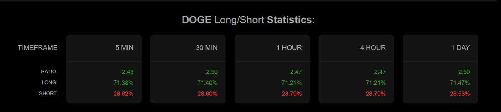 Finally, Dogecoin’s Long/Short Ratio indicates that these buyers are re-entering the market to take long positions. As such, the number of longs has spiked to 71.47% over the past day, with shorts accounting for only 28% of the futures contracts.
