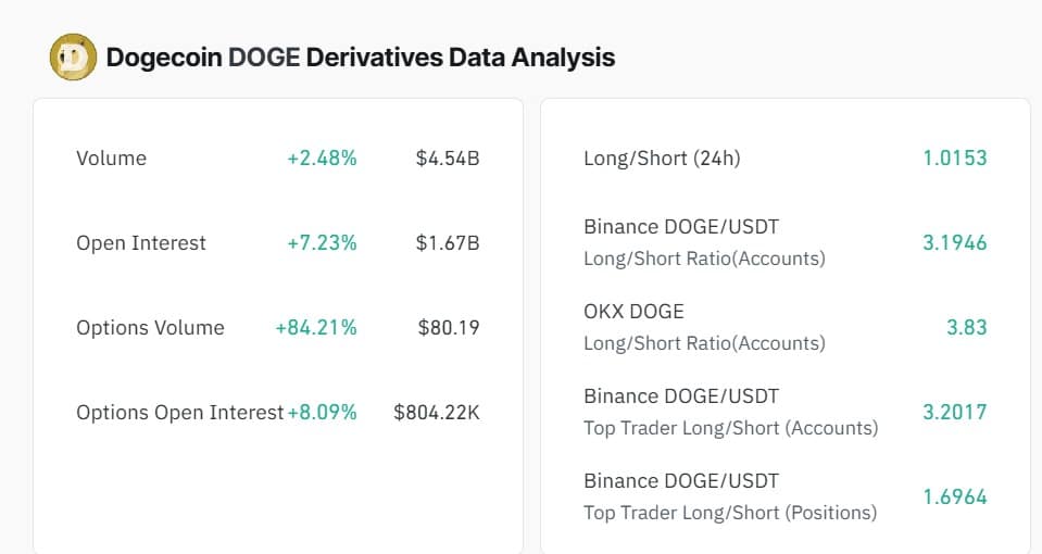 During the same period, Dogecoin’s derivatives experienced significant growth. Options volume increased by 84.21%, while Options Open Interest (OI) rose by 8% to $804k.