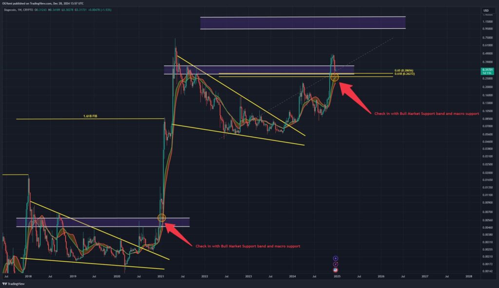 Drawing parallels to past market cycles, Kevin highlighted how Dogecoin historically checks in with its “bull market support band” and macro support levels before rallying: “We came back, we tested structure support […] bull market support band in this cycle. This is very similar to [the previous cycle]. You can’t deny the similarities.”