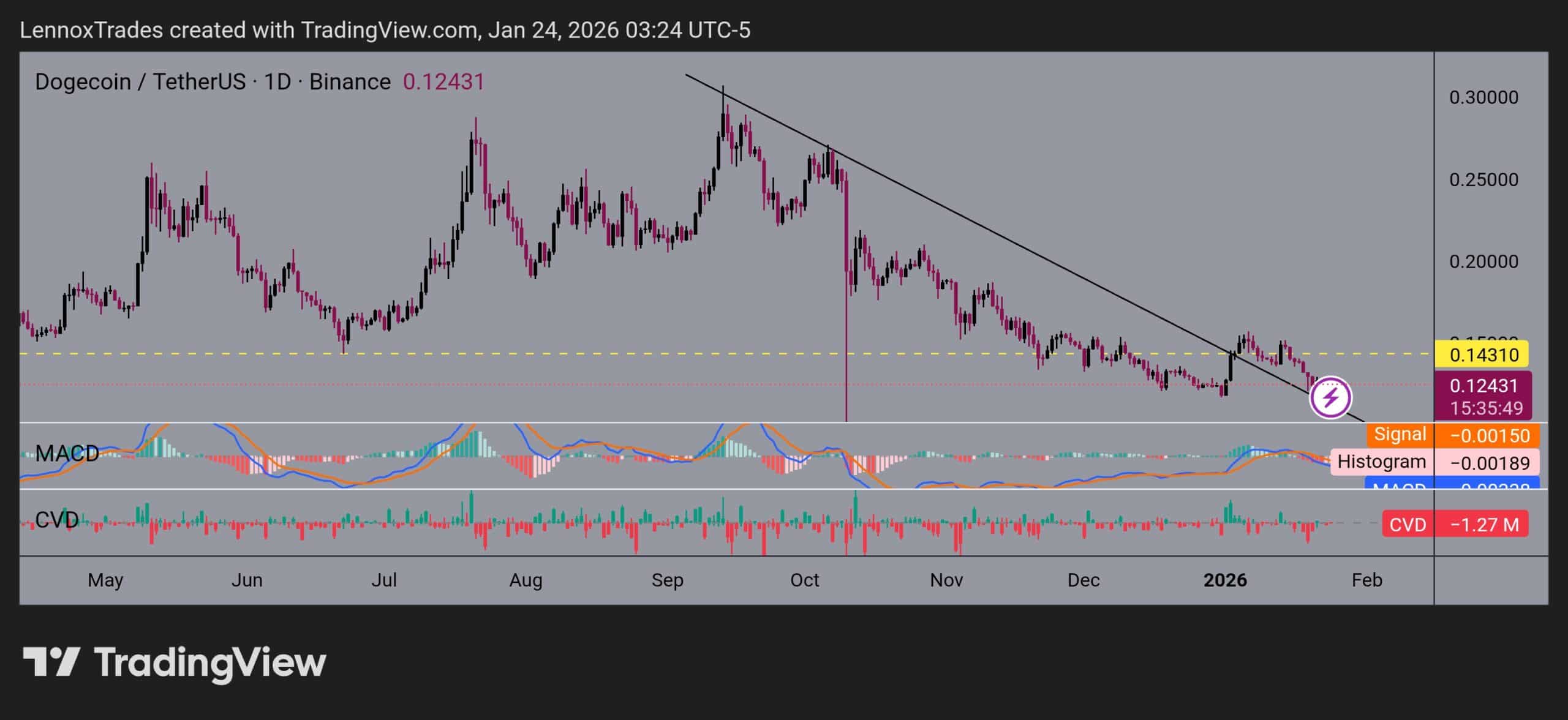 At the time of writing, Dogecoin’s price was trading above a trendline as a potential retest of the breakout. Bouncing from the $0.1243-level would propel DOGE towards levels seen in 2025 – Above the $0.30-mark.