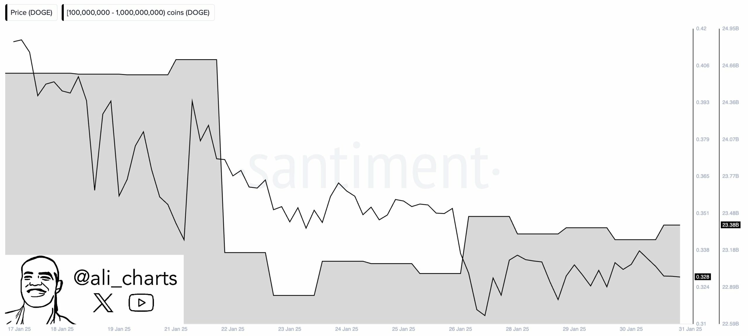 In fact, despite its 23% slump from January’s highs of $0.43, whale entities have scooped 560 million DOGE tokens. This revealed that large players took advantage of the latest price discount to add positions. According to analyst Ali Martinez’s analysis,