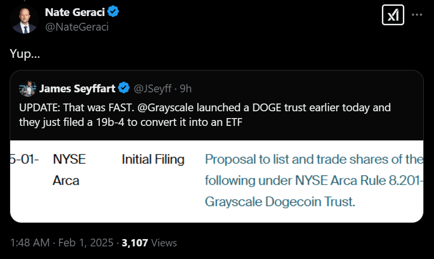 However, top ETF experts like Nate Geraci and Bloomberg’s James Seyffart, noted the firm’s plan to convert the Trust into a spot ETF.