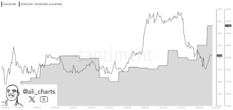 Popular crypto analyst Ali Martinez revealed on X (formerly Twitter) on January 11 that Dogecoin whales have begun accumulating again. Martinez announced the latest DOGE acquisition by these deep-pocketed investors, highlighting that Whales recently bought over 470 million tokens.