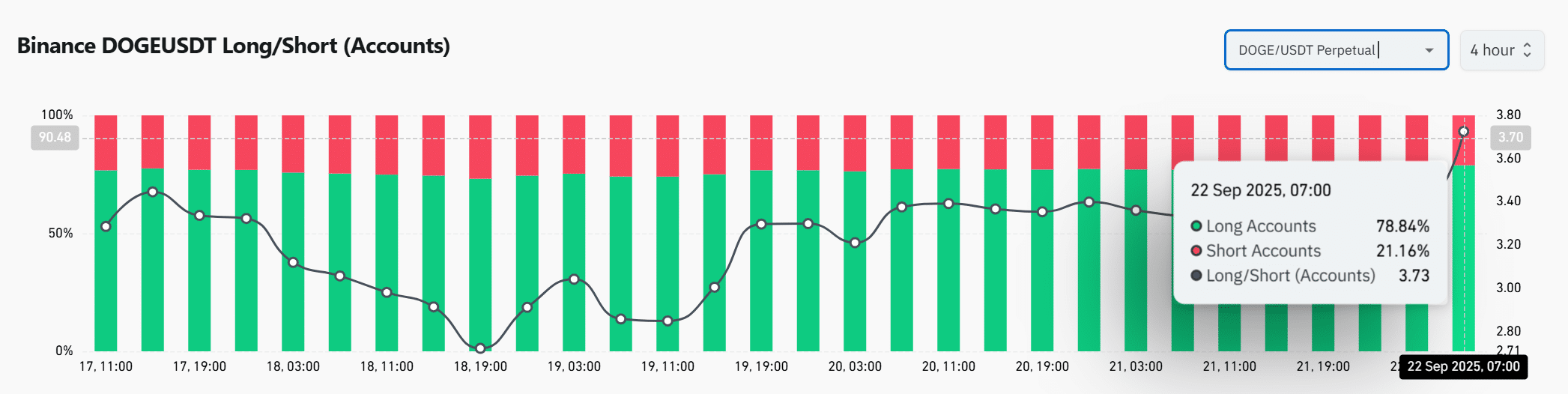 Binance’s DOGEUSDT Long/Short ratio indicated that 78.84% of accounts were holding long positions at press time, compared to just 21.16% short. This significant skew revealed traders’ conviction in a bullish continuation.
