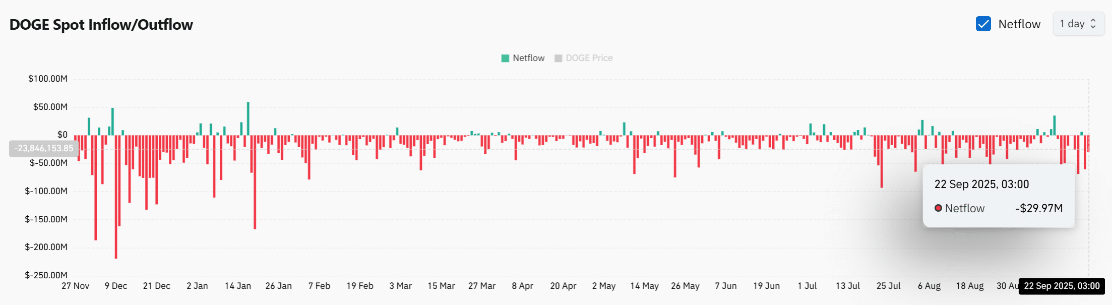 Recent DOGE Spot Inflow/Outflow data shows consistent outflows, with a notable -$29.97M recorded on the 22nd of September.