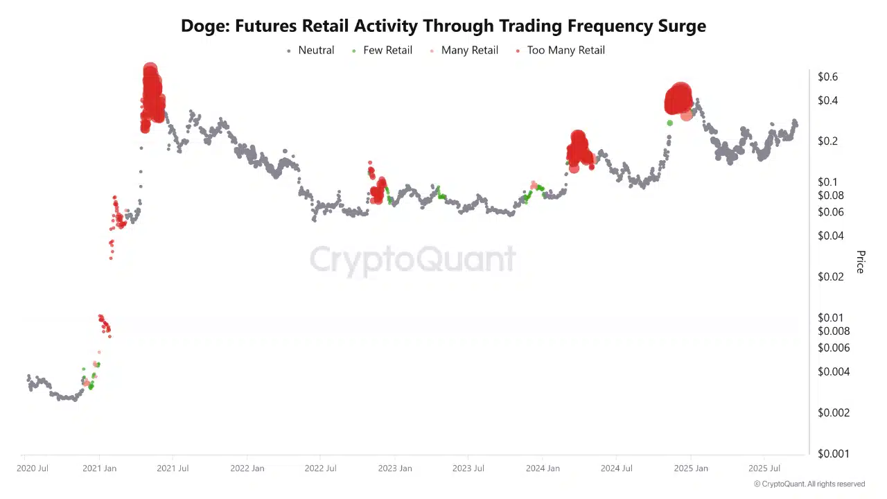 This was in contrast to past retail-driven rallies that quickly reversed, such as May 2021 when DOGE peaked at $0.69 before tumbling.