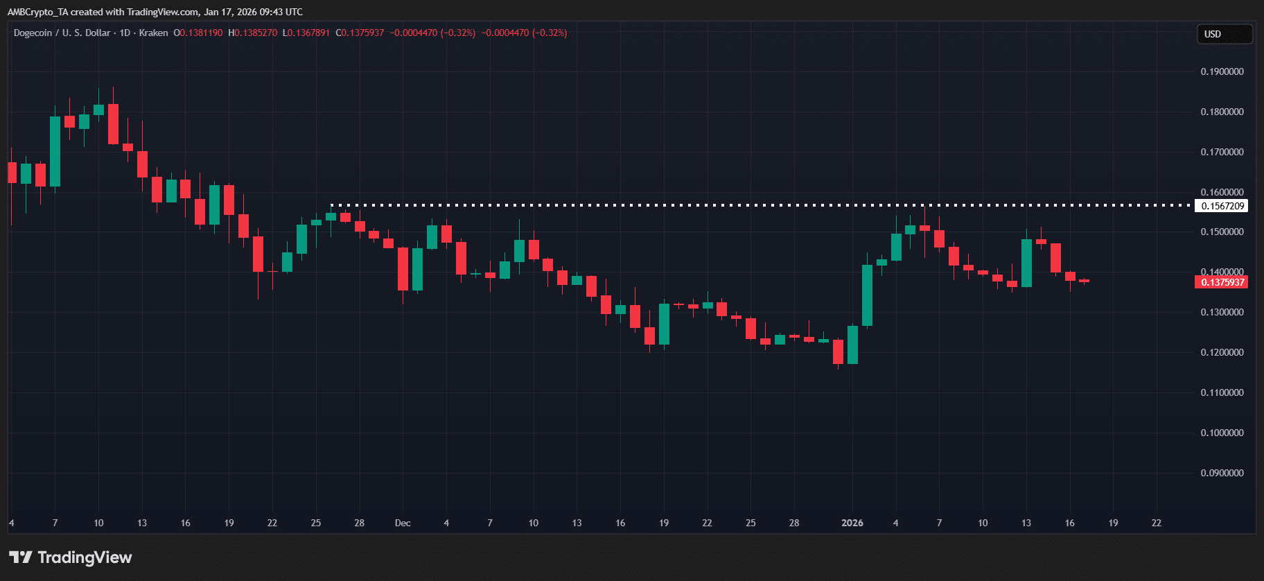 Earlier, on 14 January, DOGE tested the $0.15-level, only to pull back 7% to $0.13. Technically, if smart money steps in with its classic “buy the dip” strategy, this could determine Dogecoin’s next move.